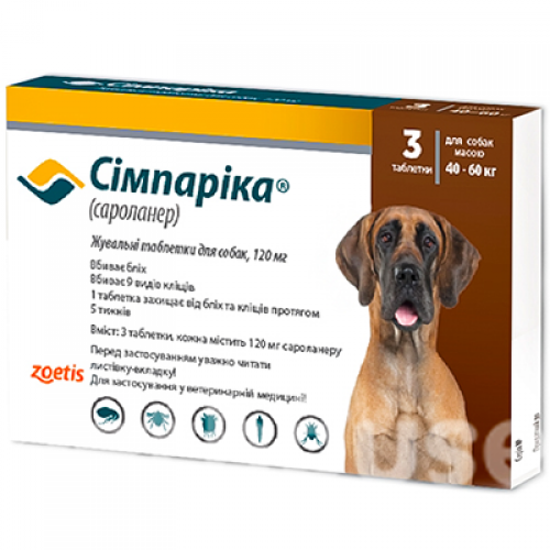 Сімпаріка 120 мг для собак 40-60 кг, 3 таблетки — жувальні таблетки від бліх та кліщів